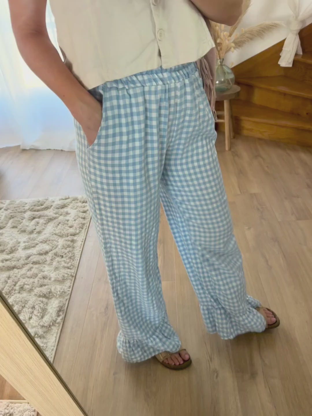 Craquez pour ce joli pantalon à carreaux vichy bleu ciel, ultra léger et confortable. Sa taille élastique s’adapte à toutes les morphologies, pour un effet loose et décontracté. On adore son tissu doux et fluide, parfait pour les journées ensoleillées ou les moments cocooning à la maison.
