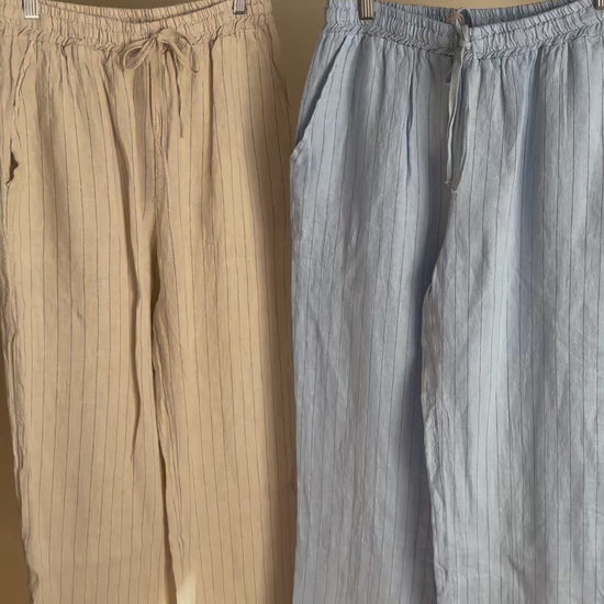 Le pantalon à rayures en lin est l’incarnation du style chic et décontracté. Sa coupe ample et fluide en fait une pièce facile à porter au quotidien, tout en offrant l’élégance naturelle du lin.